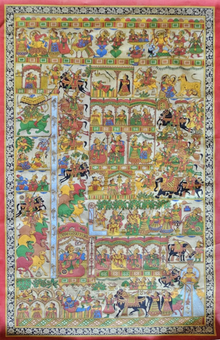 Originating in Rajasthan, Phad paintings are large textiles that portray regional epics, stories from the lives of local folk heroes and demi gods - They depict complex folk narratives, through a stylistic visual idiom developed as an accompaniment to century old oral traditions. Traditionally these paintings form a visual backdrop to nightlong storytelling performances. The singer-performers travel with these rolled up textile scrolls, which are unravelled and brought to life amidst gatherings of people.