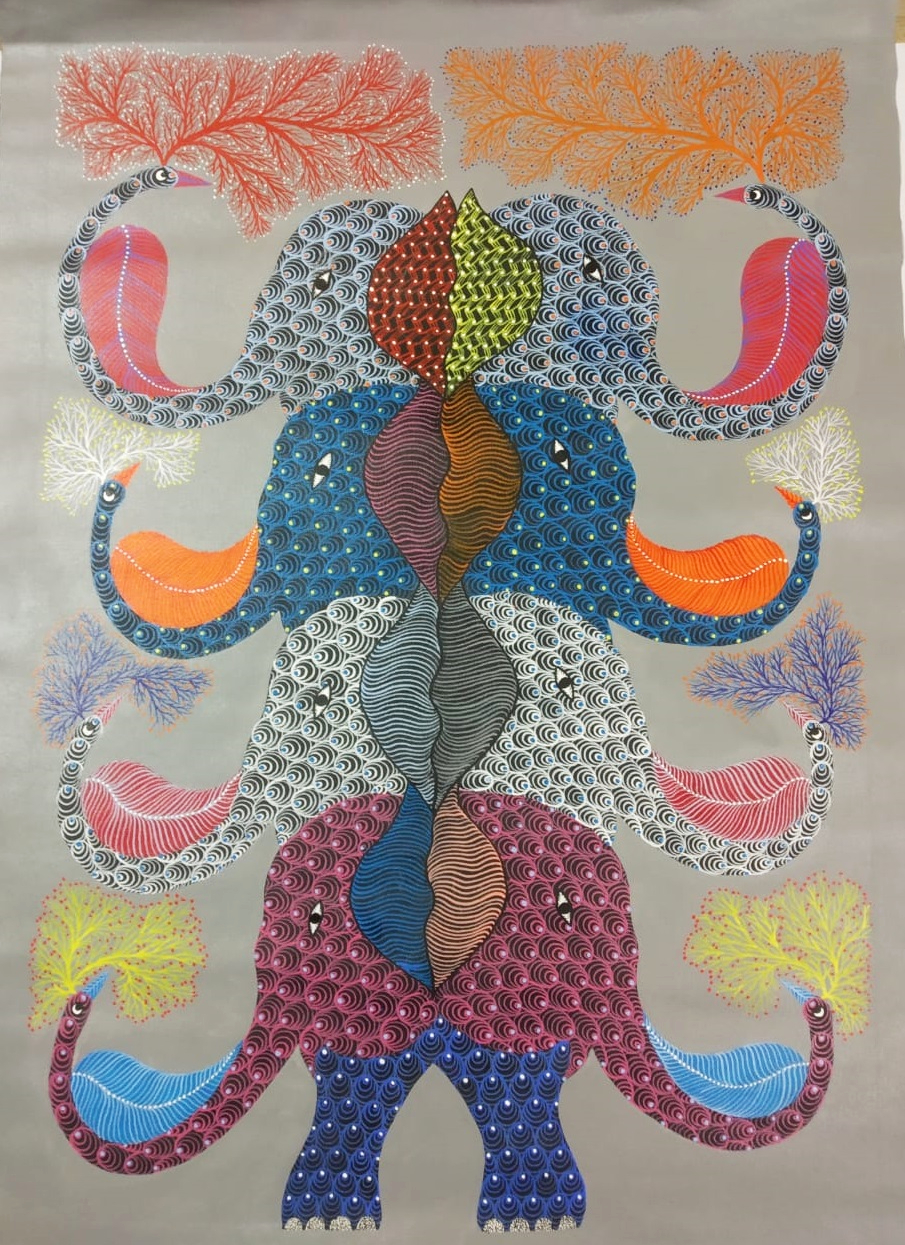 The Gond tribe believes that decorating their homes and floors with traditional motifs brings them good luck. Gond art has since transposed onto paper and canvases. The individuality of each Gond artist is defined by their signature styles.
