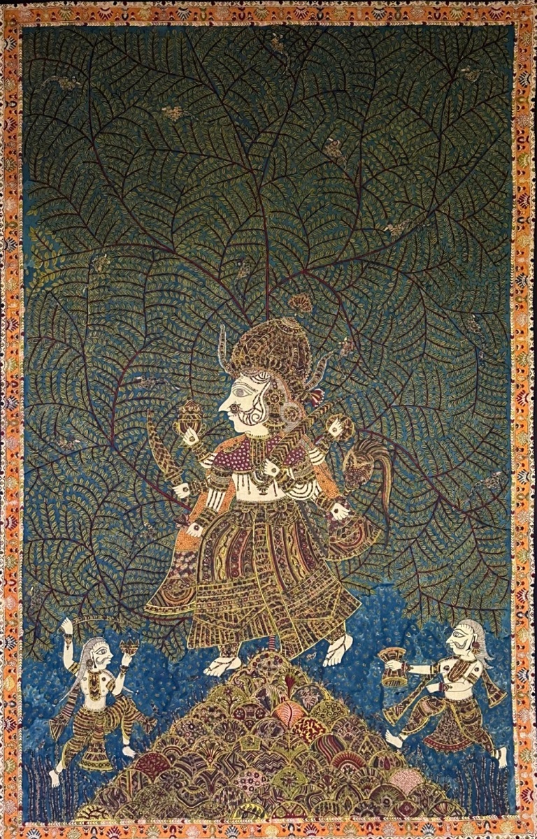 Originating in Gujrat, Mata ni Pachedi are travelling textile temples venerated by the nomadic Vaghari community. According to lore, this community was barred from entering temples due to their low caste status. As a result of their resilient devotion to the mother goddess, they createdtheir own shrines on cloth. They hung these textiles indoors, directing their worship to the 2D religious narrative. The painting's composition usually followsa set pattern, with the Mother Goddess dominating the central area, surrounded by deities and commoners worshipping her.