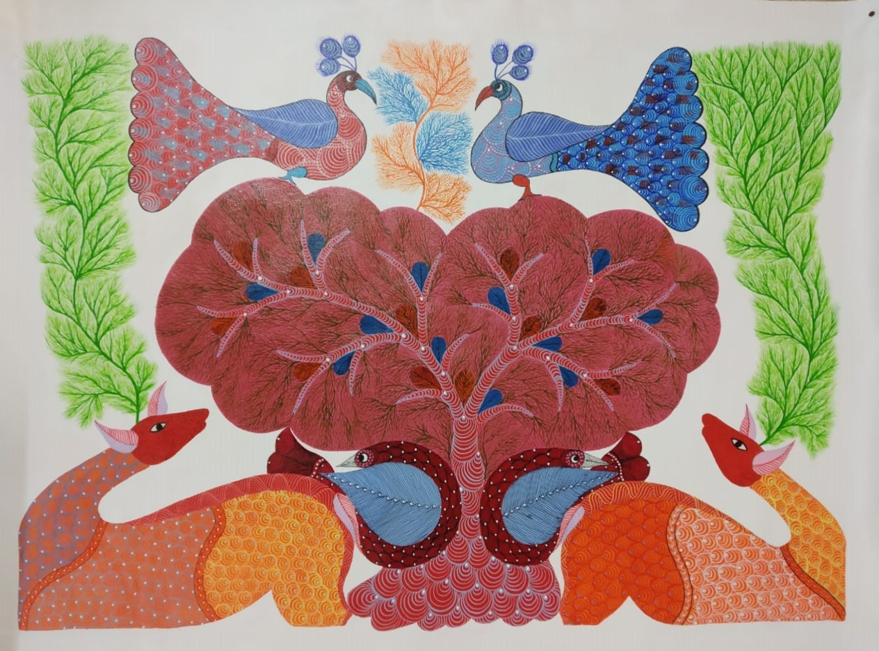 The Gond tribe believes that decorating their homes and floors with traditional motifs brings them good luck. Gond art has since transposed onto paper and canvases. The individuality of each Gond artist is defined by their signature styles.