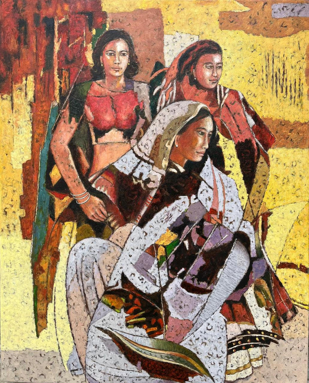 Jiten, born in Assam, had a natural artistic talent that was very apparent in childhood. He graduated in Civil Engineering in 1963 and was commissioned in the Corps of Engineers, Indian Army, in 1964. Attaining the Rank of Colonel, he retired prematurely in 1990 to devote himself to painting. Jiten has accumulated a deep knowledge of Philosophy and Sanskrit literature and this is reflected in his paintings, as are his childhood memories of day to day life in rural Assam. His work had been the subject of academic research even at a doctoral level. Jiten lives and works in Noida.