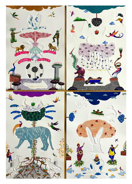| Medium : | Embossed, pen & ink and gouache on fabriano paper |