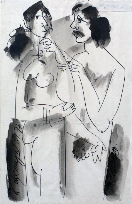 Kalal Laxma Goud was born in Nizampur, Andhra Pradesh. He works in a variety of mediums including etching, gouache, pastel, sculpture, and glass painting. A graduate of the Government College of Fine Arts and Architecture, Hyderabad, Goud went on to study Mural Painting under K.G. Subramanyan at the Faculty of Fine Arts, MSU, Baroda from 1963 to 1965 where he discovered his love of printmaking. Goud is best known for his early drawings that depict eroticism in a rural context. The Government of India honoured him with the Padma Shri in 2016. He held a solo show in Bengaluru in June 2016, titled An Inner Retrospective showcasing his works spanning 50 years. He is currently the head and teacher at Sarojini Naidu School of Performing Art, Fine Arts & Communication, at the University of Hyderabad.