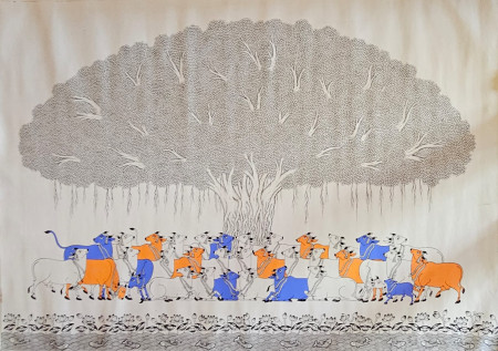 Originating in Rajasthan, Phad paintings are large textiles that portray regional epics, stories from the lives of local folk heroes and demi gods - They depict complex folk narratives, through a stylistic visual idiom developed as an accompaniment to century old oral traditions. Traditionally these paintings form a visual backdrop to nightlong storytelling performances. The singer-performers travel with these rolled up textile scrolls, which are unravelled and brought to life amidst gatherings of people.
