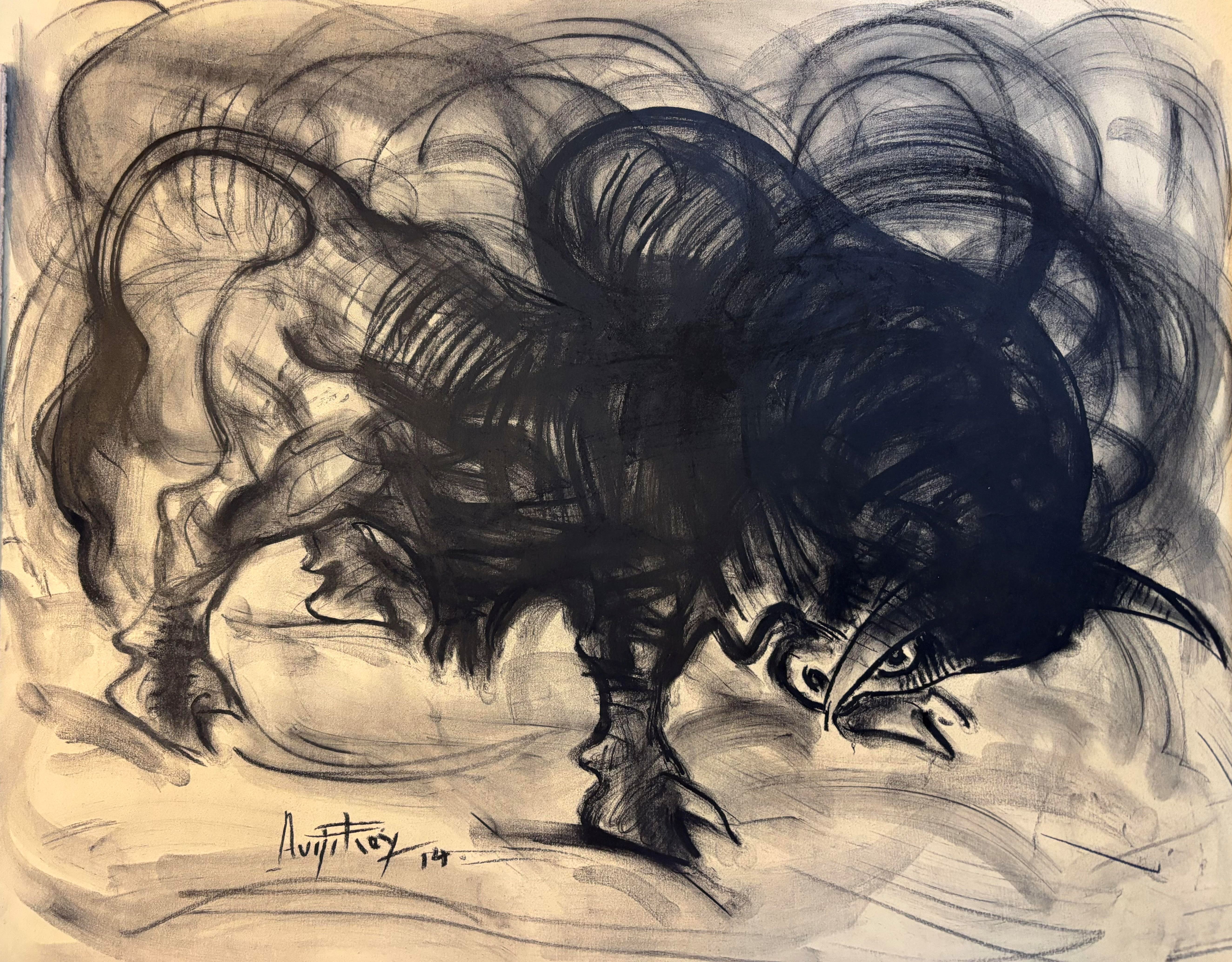 Avijit Roy Born in West Bengal, 1962 Graduated from V.A.F.A., Rabindrabharati University, West Bengal Post Diploma in Graphic Design, the Faculty of Fine Arts, M.S. University in Baroda He has several solo shows to his credit in India, U.K., Germany, and Australia, besides having done several workshops in India and the U.K. His initial works included many images of the mammoth black bull in its many manifestations. He experimented with Chine Colle, a simple technique in which subtle color and the textural contrast between rice paper and the base paper are highlighted, and this technique is increasingly seen in his rendering of the Buddha. The artist lives and works in New Delhi.