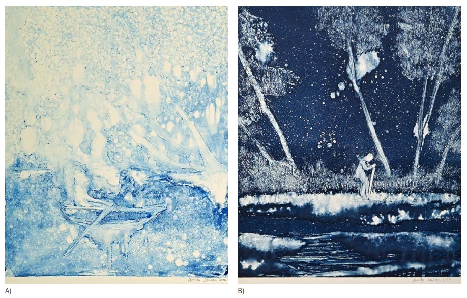 The starting point for many of her paintings are family photos, historical images, popculture and film. She explores themes of alienation and nostalgia through her work, imbuing in it a sense of narrative mystery. She works in a variety of mediums, ranging from oil paintings, watercolour and printmaking